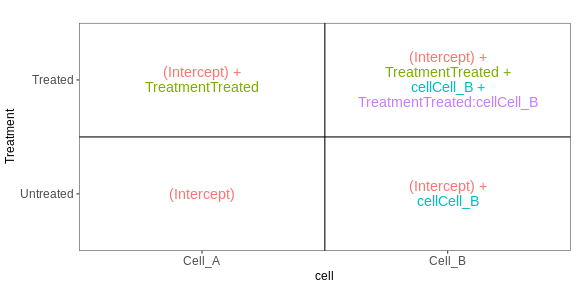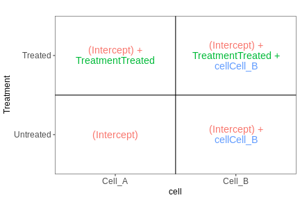 This means that the \(\beta_0\) term represents the expression level of the gene in the control samples, this coefficient is usually called the intercept