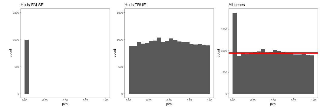 The figure on the right illustrates the principle behind the FDR adjustment. The False discovery rate (FDR) is the expected proportion of false positives among all the results considered as “significant” (i.e. pval < 0.05). The adjustment procedure estimate the proportion of hypothesis that are null and then adjust the p-values accordingly.