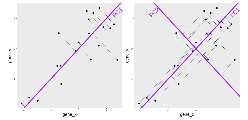 In general, and in particular in the projections above, we lose information when reducing the number of dimensions (above, from 2 (plane) to 1 (line)). In the first example above (left), we lose all the measurements of gene y. In the second example (right), we lose all the measurements of gene x.