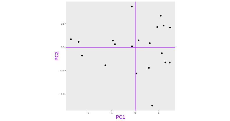 After rotating the plot such that PC1 becomes the horizontal axis, we obtain the PCA plot: