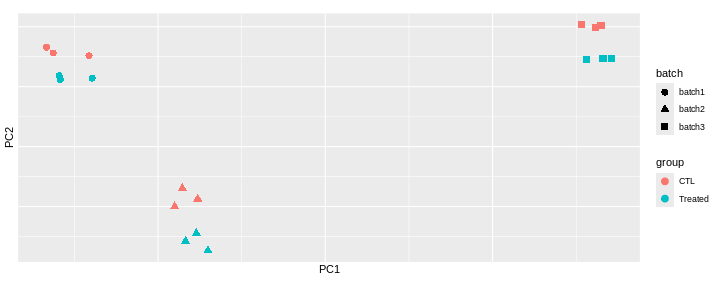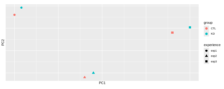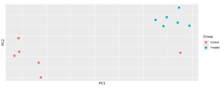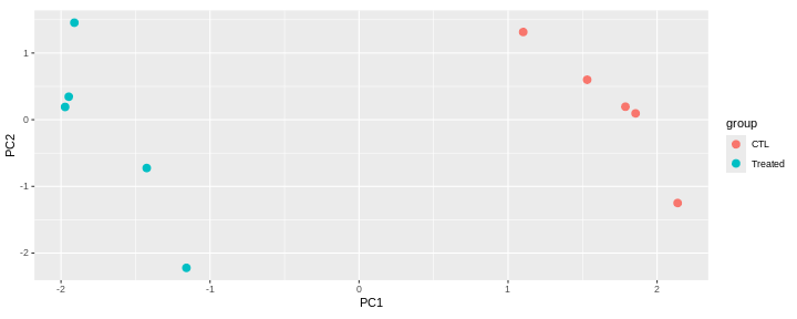 This PCA plot shows that the samples cluster into two distinct groups along PC1. This separation indicates that the “CTL” and “Treated” samples have different overall expression profiles.