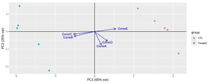 Loadings can be visualised on a biplot, where the arrows show the contribution of each gene to the principal components.