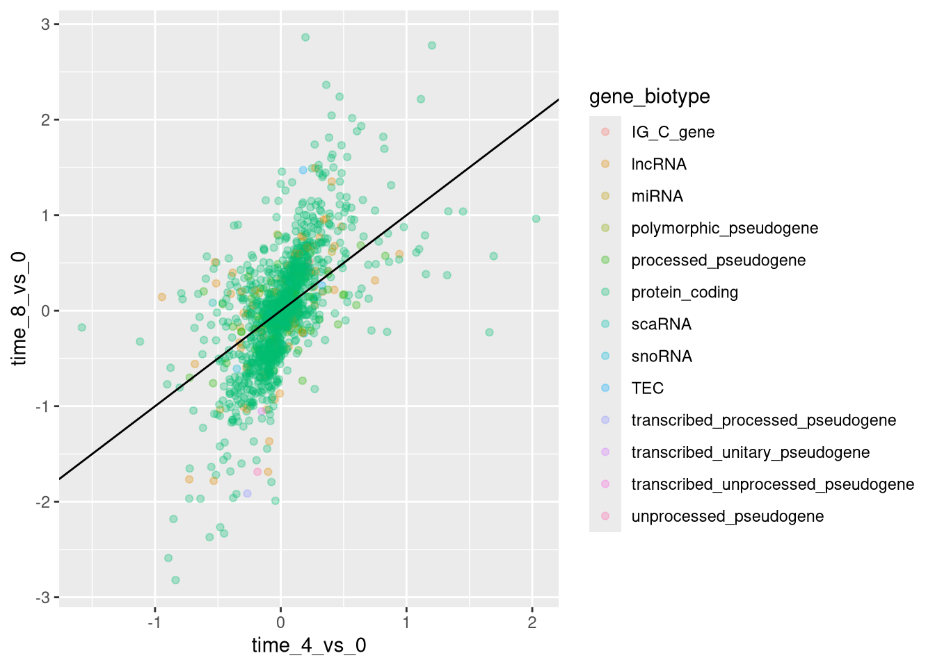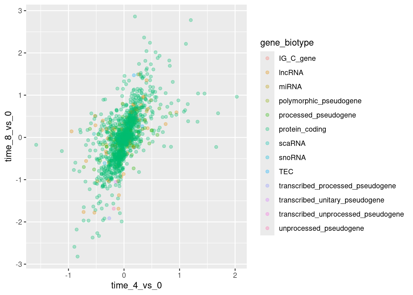 This graph will represent the log2 fold changes of expression comparing time 8 versus time 0 and time 4 versus time 0. To this end, we first need to compute the means of the log-transformed expression values by gene and time then the log fold changes by subtracting the mean log expressions between time 8 and time 0 and between time 4 and time 0. Note that we also include here the gene biotype that we will use later on to represent the genes. We will save the fold changes in a new data frame called rna_fc.