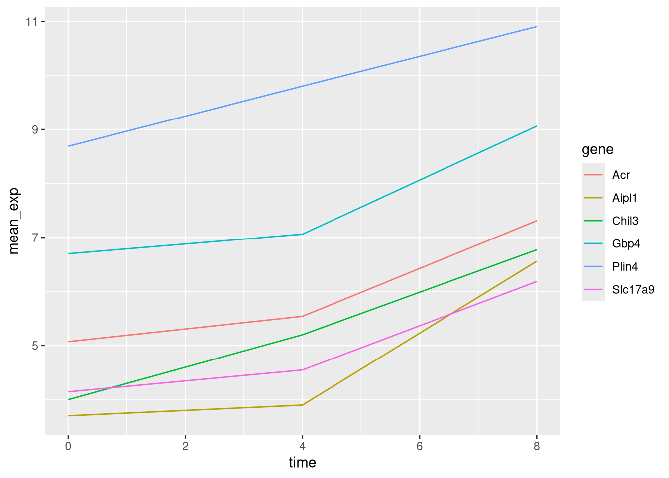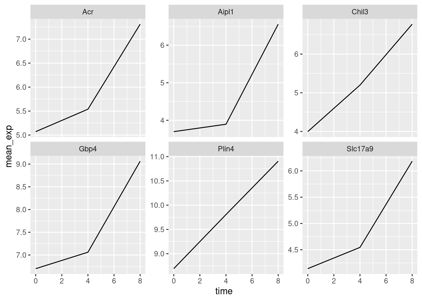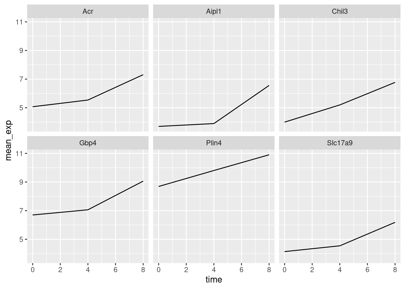 mutate(time_8_vs_0 = `8` - `0`, time_4_vs_0 = `4` - `0`)## `summarise()` has grouped output by 'gene', 'time'. You can override using the
