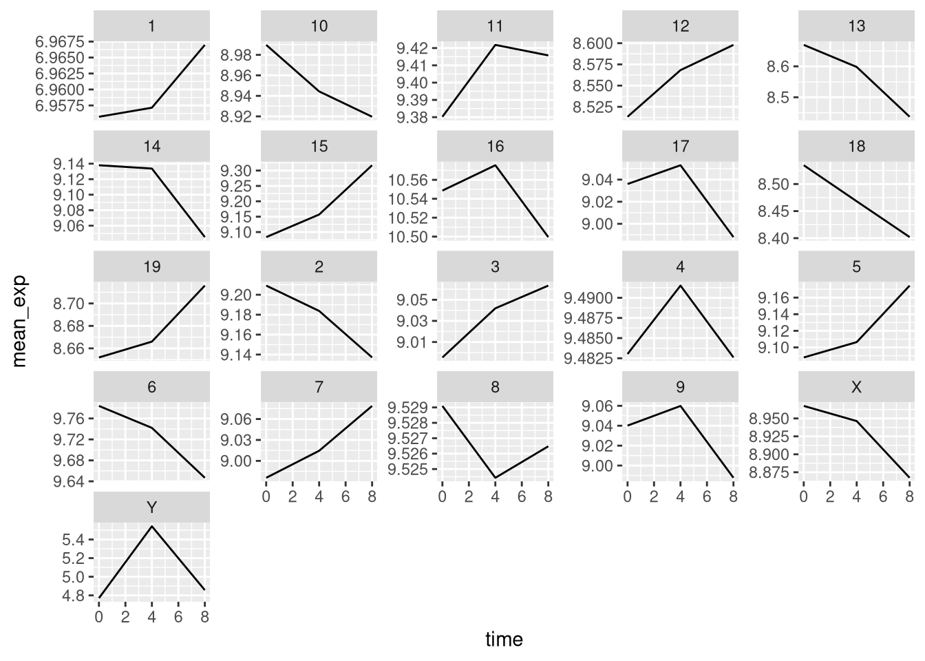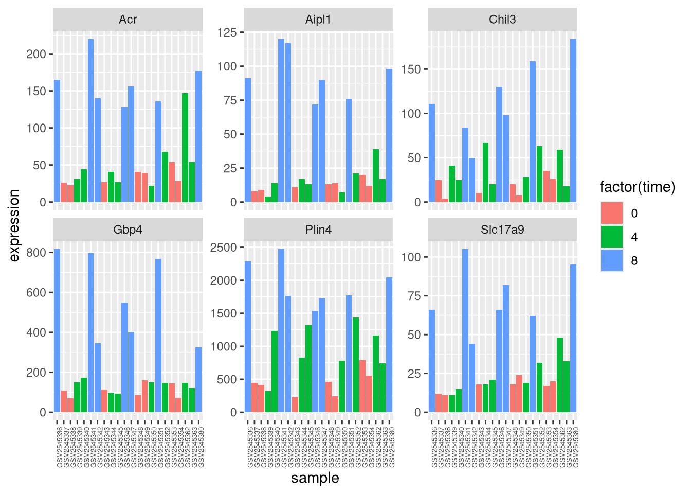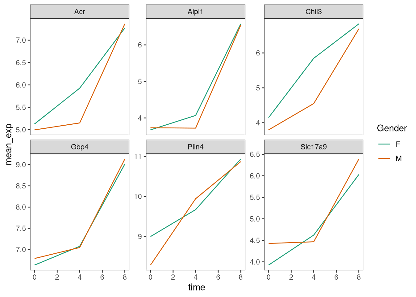 mutate(time_8_vs_0 = `8` - `0`, time_4_vs_0 = `4` - `0`)## `summarise()` has grouped output by 'gene', 'time'. You can override using the